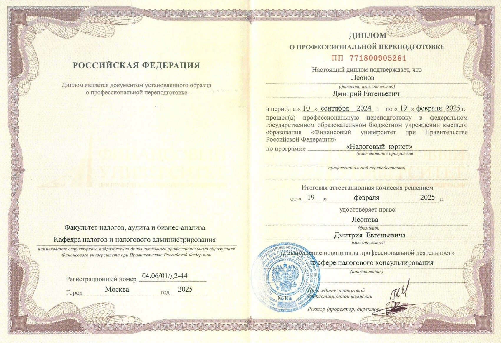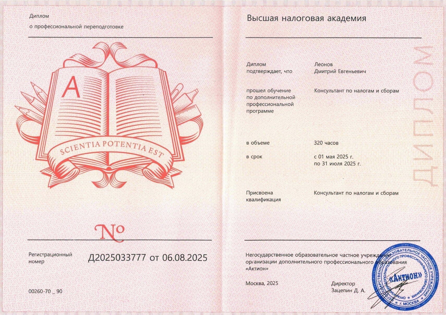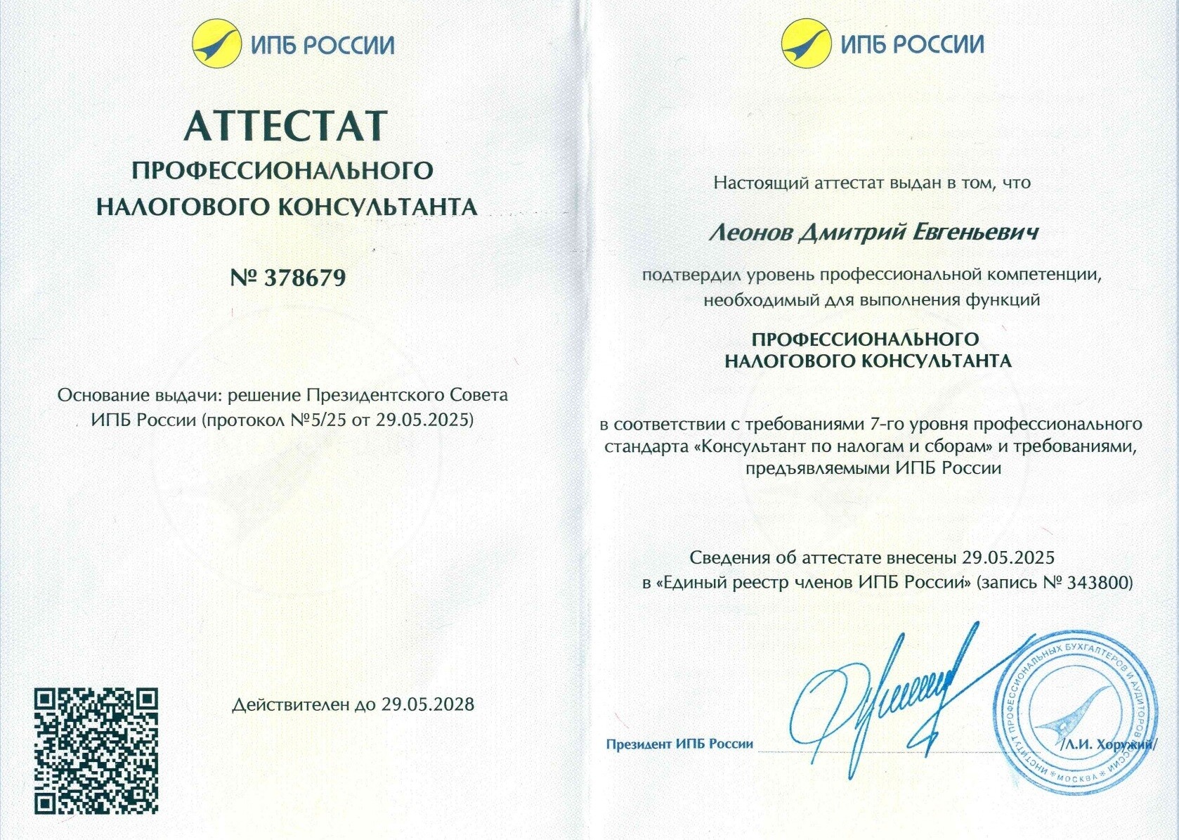 Аттестованный Профессиональный налоговый консультант (7-го уровня квалификации). Членский билет N 7781958