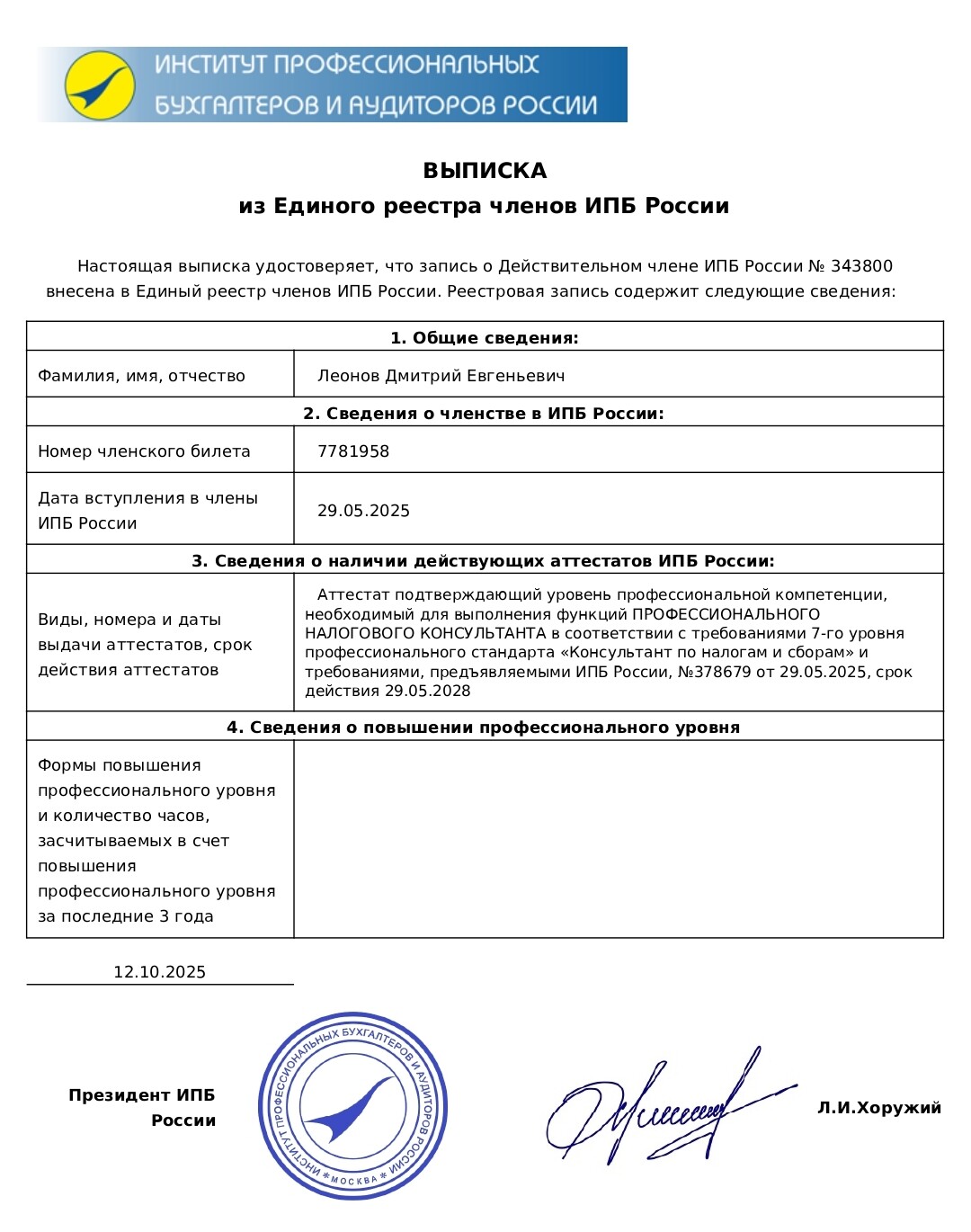 Действующий член Института профессиональных бухгалтеров и аудиторов России